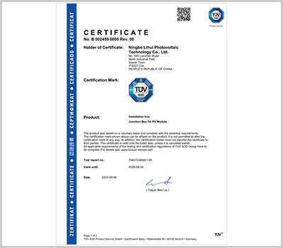 麗輝光伏通過多年的努力和發(fā)展,秉承以人為本、質(zhì)量優(yōu)先、客戶至上的生產(chǎn)銷售理念,已經(jīng)形成多種系列光伏接線盒、光伏連接器的專業(yè)生產(chǎn)制造商,我們產(chǎn)品具備:品種多、設(shè)計(jì)新穎、市場覆蓋區(qū)域性廣等特征,產(chǎn)品備受廣大客戶所青睞,目前本公司產(chǎn)品主要銷往中國各地、德國、意大利、瑞士、西班牙、墨西哥、泰國、越南、印度、土耳其、澳大利亞等國家和地區(qū)。麗輝光伏結(jié)合10多年連接器生產(chǎn)管理的經(jīng)驗(yàn),企業(yè)通過了ISO9001等體系認(rèn)證,同時(shí)我們擁有標(biāo)準(zhǔn)現(xiàn)代化廠房,并配備各種自動(dòng)化生產(chǎn)設(shè)備、先進(jìn)檢測設(shè)備,依托多個(gè)知名的認(rèn)證服務(wù)商,產(chǎn)品通過TUV等認(rèn)證,目前我們接線盒日產(chǎn)量達(dá)到9萬套。我們將會站在市場需求的前沿,為太陽能光伏事業(yè)、為綠色可再生能源、為減少碳排放而不斷地努力!